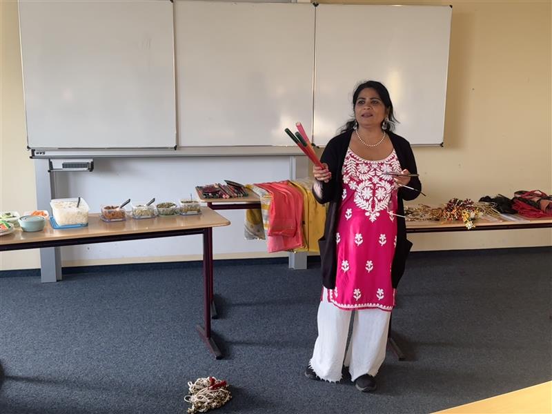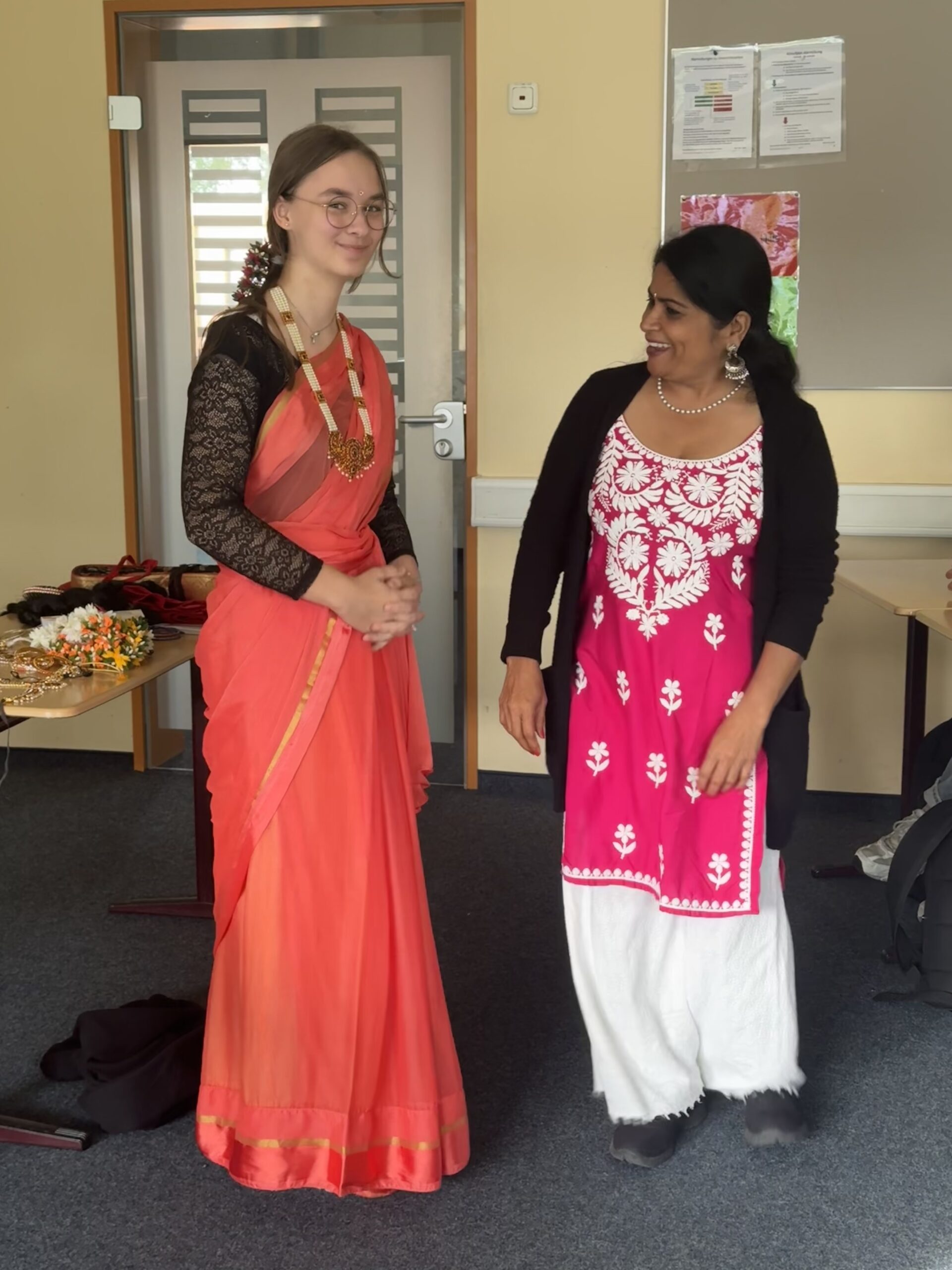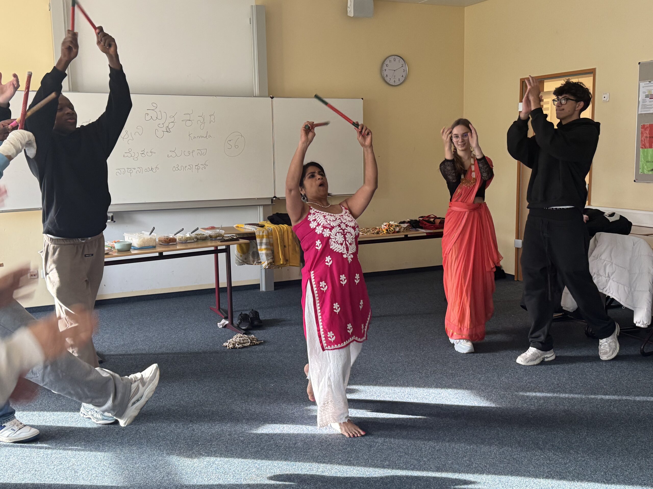 Neben den Erzählungen brachte Harriet auch ganz praktische Eindrücke von ihrer Heimat mit: Die Klasse durfte selbstgekochte Kostproben indischer Speisen genießen, sie zeigte, wie Saris getragen werden, demonstrierte traditionelle Tanzschritte und stellte sich den vielen Fragen der Jugendlichen.